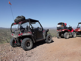 We met Ray, Kay, Tom and Jeremy up on Wickenburg Mountain and started our ride. We travelled over varied terrain which included the same narrow canyons and washes we took with Keith and Charlotte in the jeep. It was a beautiful day for a ride with the breeze helping to keep some of the dust off the trail. We stopped for a hot dog roast and several beverages along the way and eventually made it back to the split in the trail where, John and I headed back to the bus and Vulture Peak Road with Tim and Rosco and the rest of the quads headed back to Wickenburg and home. It was getting late and time for all of us to be getting off the trail and avoiding the cool temperatures when the sun went down. It was a good ride and we managed to show Tim a few more trails so that he will eventually get more familiar with them and of course John and I got to meet another one of Ray and Kay's friends in Jeremy. We have riden with Tom before and he is always interesting to listen to.