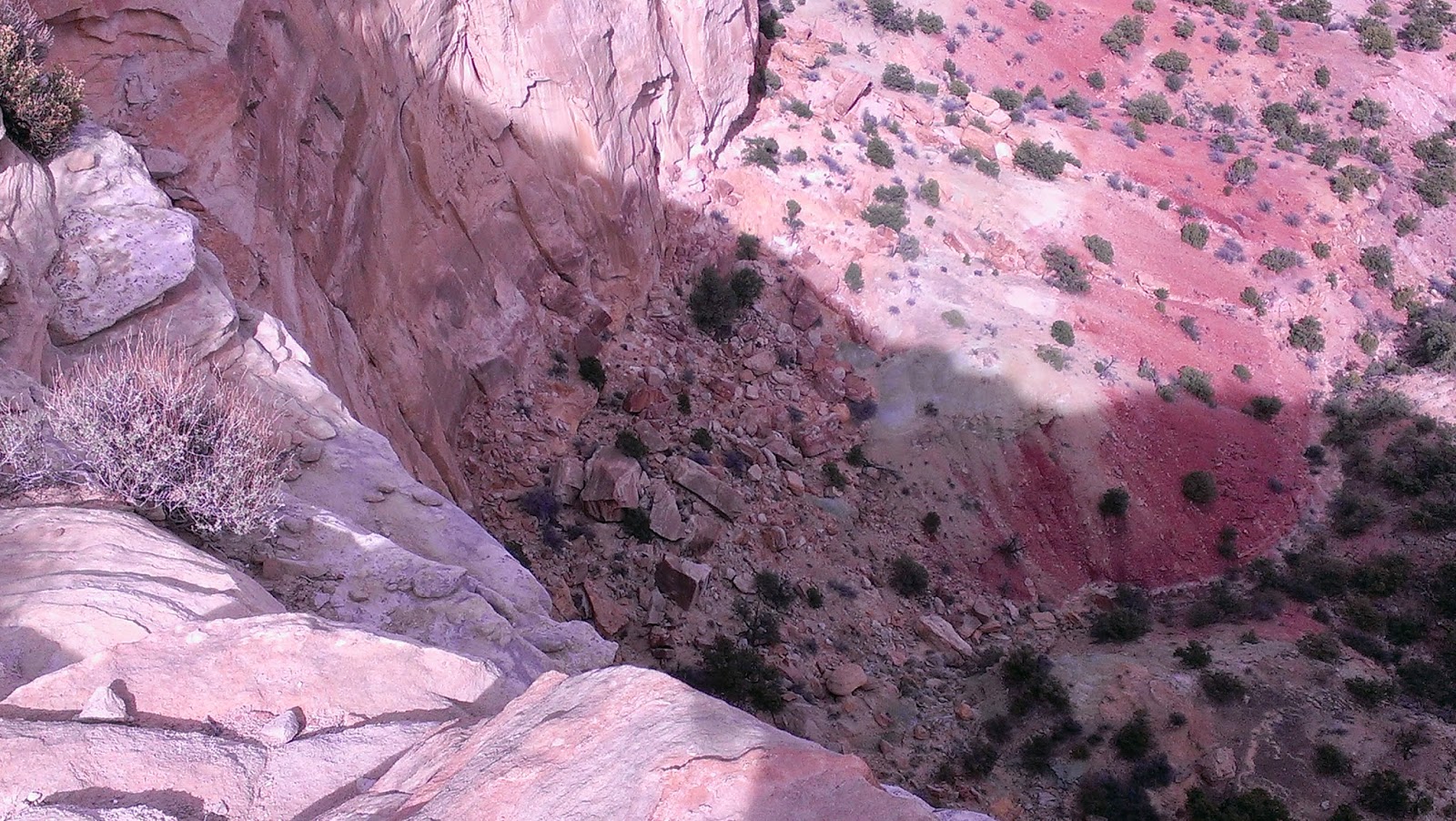 Once we accessed the North Fork of Coal Wash Trail, the travel was along a few shelf trails and consisted of mostly rock. There was one spot on the trail that was VERY adventurous and John had to come and save me as I managed to get myself into a bit of a bind when I took the wrong path down and was stopped by a rather large bolder. These boulders had fallen off the face of the mountain that we were trying to traverse and had filled the trail. It definitely made for an interesting descent!! This piece of trail was only about 100 feet long but it was challenging!! With both of us safely past this point we continued to skirt along the edge of the wilderness study area. It is in this area that I imagine the big horn sheep make their home as it is indeed mountainous.