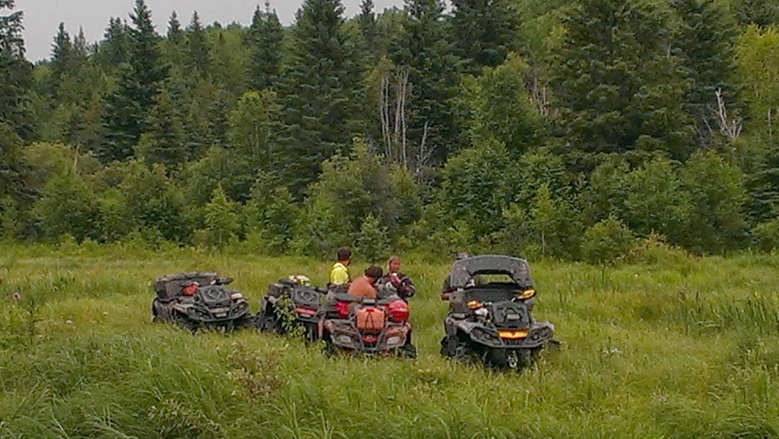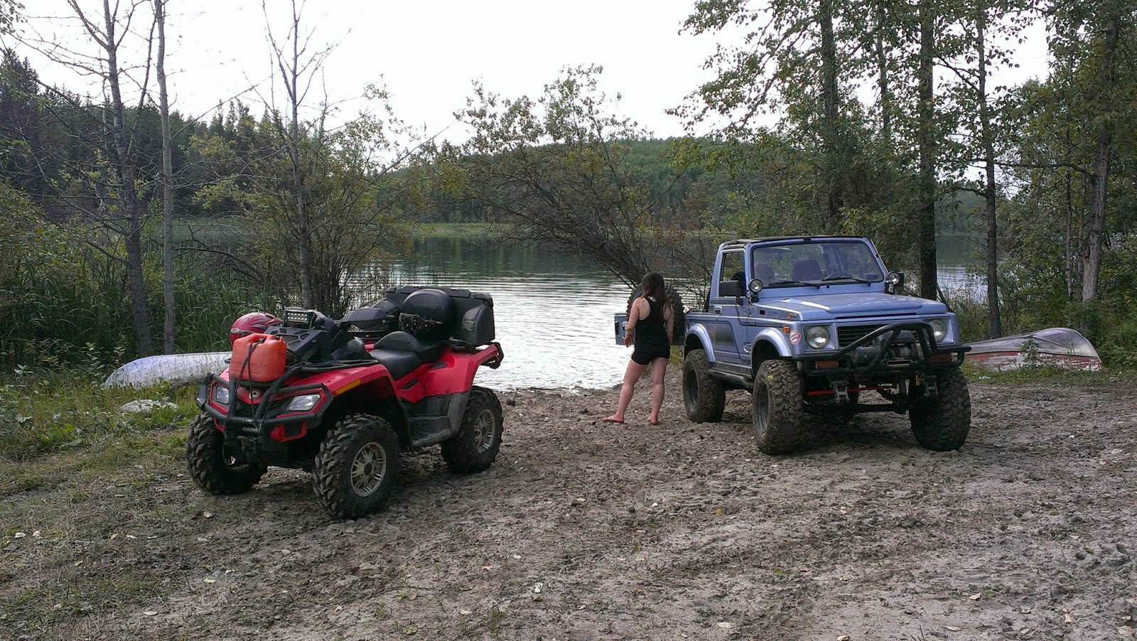 We accessed the grid and then had to drive at least 16K to access the trail that would lead us back towards home. Of course driving the grid that many miles at a good speed, did not take very long and we were soon headed over to McRobb Lake. Of course we had to check out "the wet way" home and Jace found himself stuck up to his eyeballs near Chute Lake. This was a great big FAIL and it took a while to get him unstuck.. It took two winches to finally convince the muskeg to let go of its prize!!